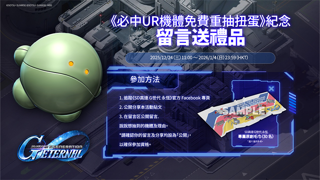 追蹤《SD高達 G世代 永恆》官方 Facebook 專頁→ https://www.facebook.com/ggene.eternal.hk/ -