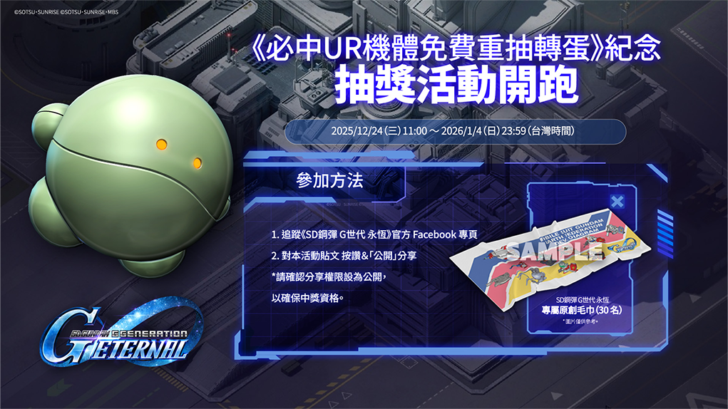 欲參加本活動,請至《SD鋼彈 G世代 永恆》官方Facebook 粉絲專頁(https://www.facebook.com/ggene.eternal.tw),並完成以下所有步驟: